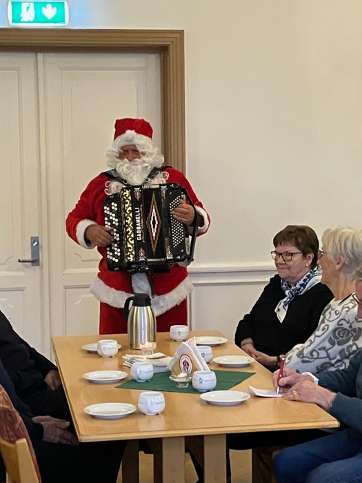 På årets julebingo dukket selveste julenissen med trekkspill opp. Bak masken skjulte det seg Alf Aune som bidrog med lystig trekkspillmusikk til vår allsang denne gang. Flere julesanger ble sunget, den siste var Deilig er jorden. Alle 29 som var tilstede reiste seg da den ble sunget.